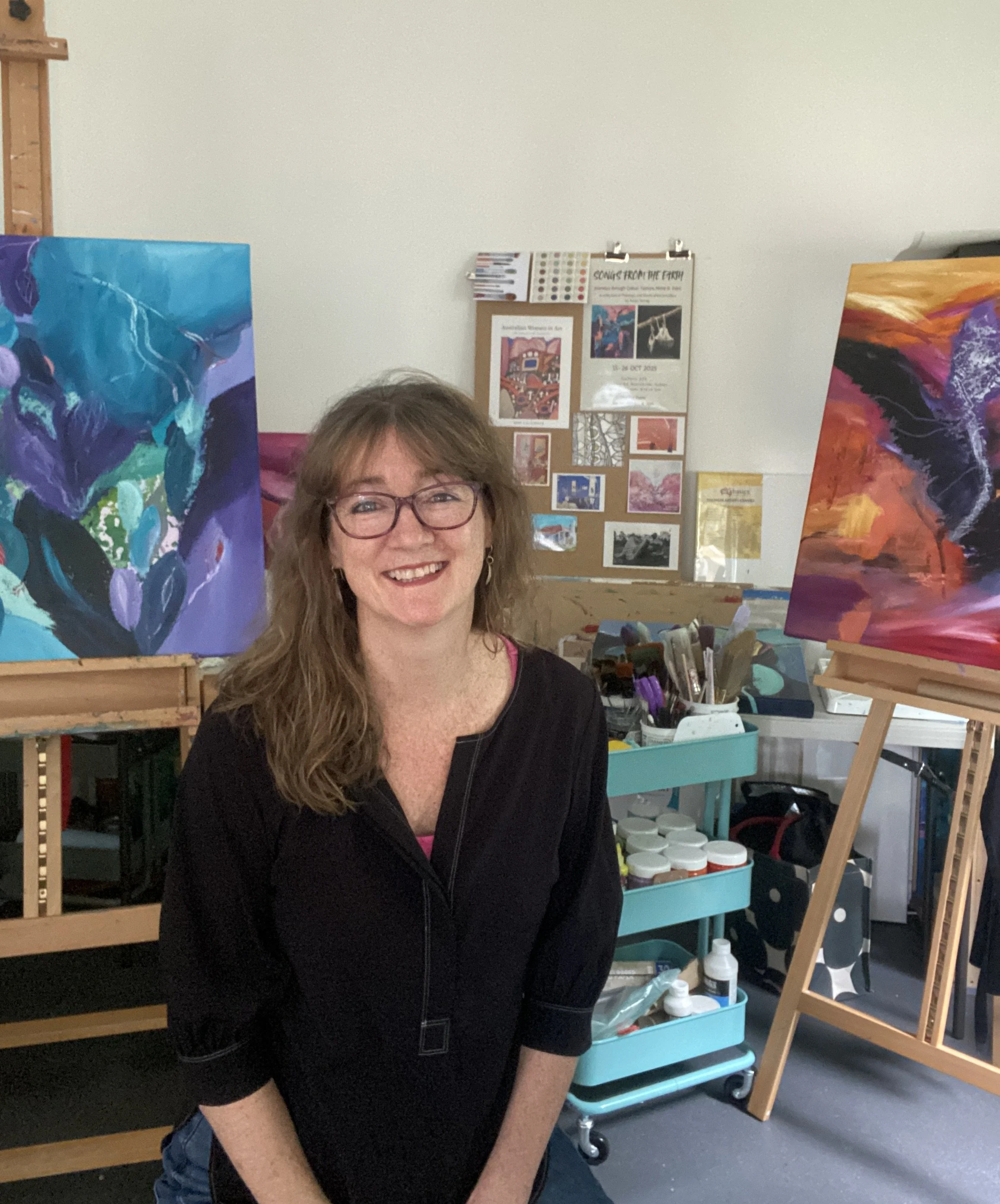 I work across canvas, paper and wood, using acrylic and oils. My approach is intuitive and rarely begins with a fixed plan. Instead, I respond to marks, building multiple layers that create depth and contrast within the work.